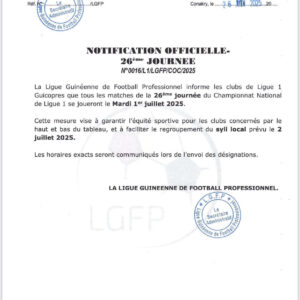 La Ligue guinéenne de Football Professionnel (LGFP) a annoncé via une notification adressée aux clubs, que la saison de Ligue 1 Guicopres s’achèvera le mardi 1er juillet 2025.