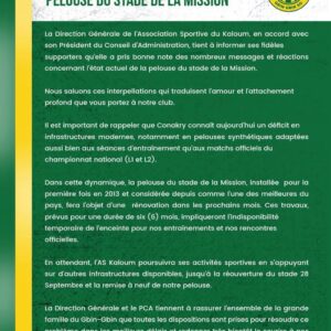 Via un communiqué publié ce lundi 29 septembre 2025, la Direction Générale de l’AS Kaloum a informé ses supporters que la pelouse du stade de la Mission fera l’objet d’une rénovation prochaine. Cette décision, prise par le PCA Bouba Sampil, répond aux nombreuses plaintes des joueurs et supporters concernant l’état actuel du terrain.